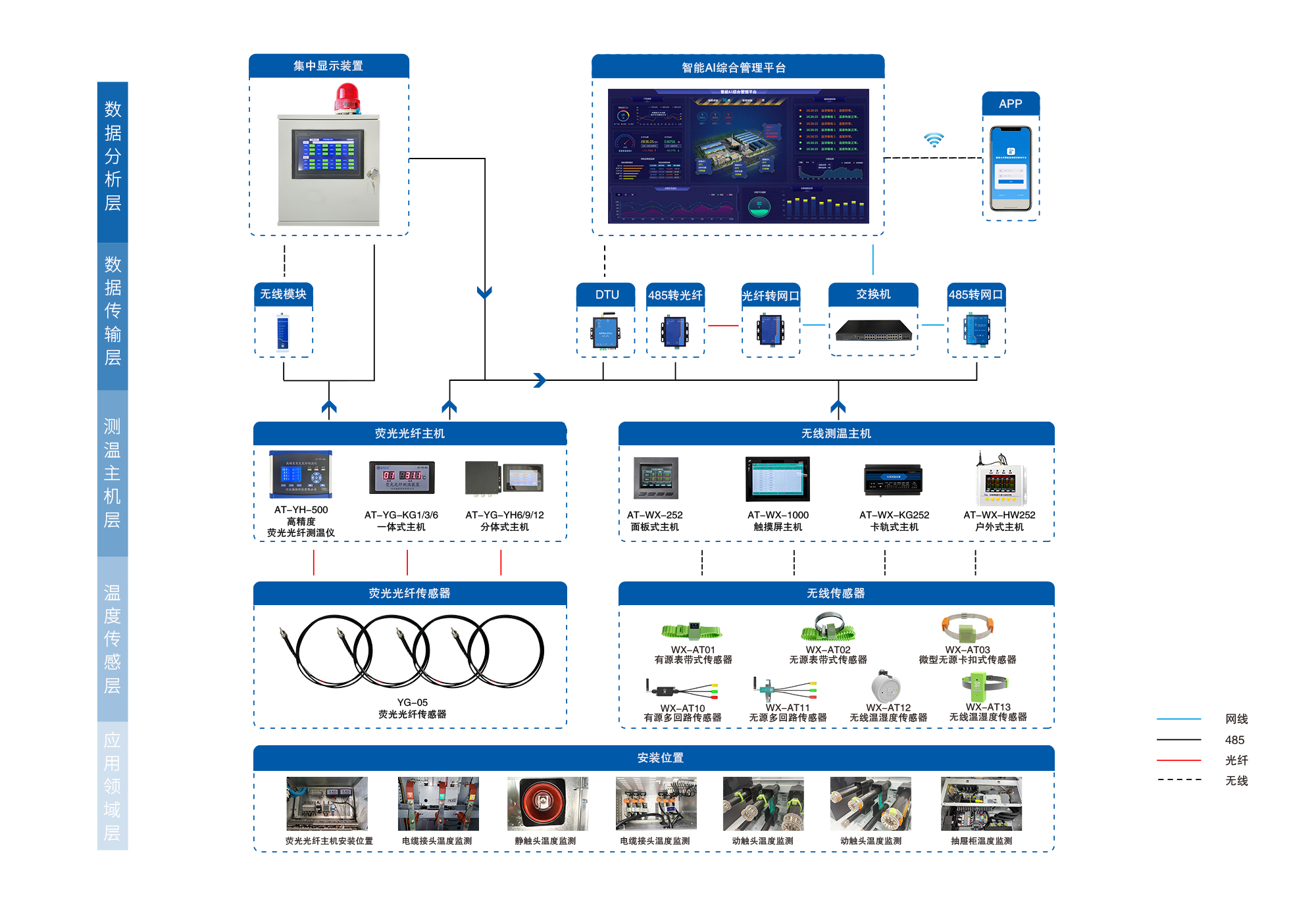 微探科技配電室綜合在線監(jiān)測(cè)系統(tǒng)主要針對(duì)配電室內(nèi)開(kāi)關(guān)柜、變壓器等設(shè)備進(jìn)行溫度監(jiān)測(cè),開(kāi)關(guān)柜內(nèi)母線室、斷路器室,電纜室等部位進(jìn)行監(jiān)測(cè),根據(jù)需要可對(duì)整個(gè)空間進(jìn)行溫度監(jiān)測(cè)布局,涉及到的測(cè)溫產(chǎn)品主要有無(wú)線類測(cè)溫產(chǎn)品、熒光類測(cè)溫產(chǎn)品,同時(shí)兼具多臺(tái)開(kāi)關(guān)柜甚至在不同區(qū)域,本公司配電室綜合在線監(jiān)測(cè)系統(tǒng),可以將所有測(cè)溫主機(jī)的數(shù)據(jù),通過(guò)有線(RS485)或者無(wú)線(物聯(lián)網(wǎng))進(jìn)行整合,系統(tǒng)運(yùn)行穩(wěn)定,且集顯示,數(shù)據(jù)分析,報(bào)警提示、數(shù)據(jù)存儲(chǔ)及轉(zhuǎn)發(fā)等功能于一身,并提供豐富的可視化組件(可根據(jù)用戶需求進(jìn)行定制),數(shù)據(jù)展示形象化,溫度異常報(bào)警及時(shí)、具象,可以滿足不同場(chǎng)景下的展示需求。