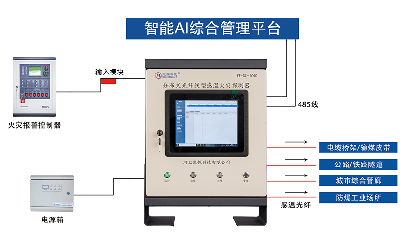 河北微探科技有限公司自主研發(fā)設(shè)計的WT-GL-100C分布式光纖線型感溫火災(zāi)探測器,是以GB 16280-2014《線型感溫火災(zāi)探測器》為設(shè)計依據(jù),運用OTDR 技術(shù)和 Raman 散射光對溫度敏銳特性,結(jié)合高頻脈沖激光、波分復(fù)用、高頻信號采集及微弱信號處理等技術(shù)來探測出光纖不同位置的溫度變化,不僅能穩(wěn)定準(zhǔn)確地預(yù)報火警,還能準(zhǔn)確定位火情發(fā)生位置。鑒于光纖本身不導(dǎo)電的特性,該產(chǎn)品更適合應(yīng)用于易燃、易爆等危險區(qū)域和有強電磁干擾、腐蝕、高溫和防爆要求的工業(yè)項目的溫度探測。