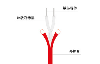 可定位傳感器為兩芯結(jié)構(gòu),兩根有固定電阻率的鋼芯導(dǎo)體外包覆ntc熱敏絕緣層,當(dāng)傳感器受熱達(dá)到報(bào)警溫度時(shí), ntc熱敏絕緣層融化,兩根鋼芯導(dǎo)體接觸,線型溫度定位儀根據(jù)傳感器的電阻判斷出火警位置,進(jìn)行定位顯示報(bào)警。